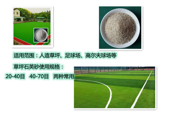 ? ? ? ? 人造草坪石英砂采用石英為原料,破碎、篩分成均勻顆粒狀、具有硬度高、比重大、粒度均勻、棱角小,顏色自然等特點,對人造草坪損傷小、形成保護草毛的作用、使草坪更為耐用且防滑、不存水、雨天不影響場地使用。是現(xiàn)代田徑場、足球場、高爾夫球場等人造場地配套使用的材料。